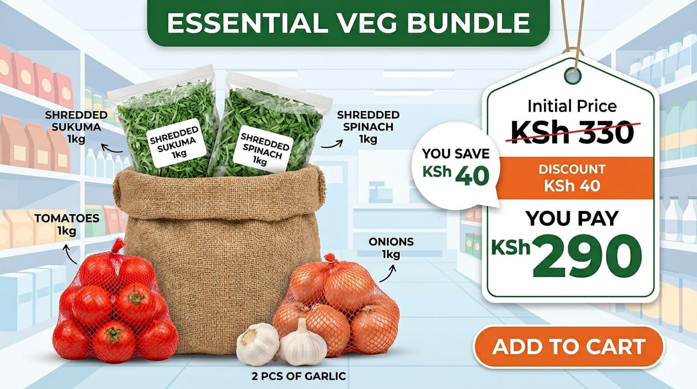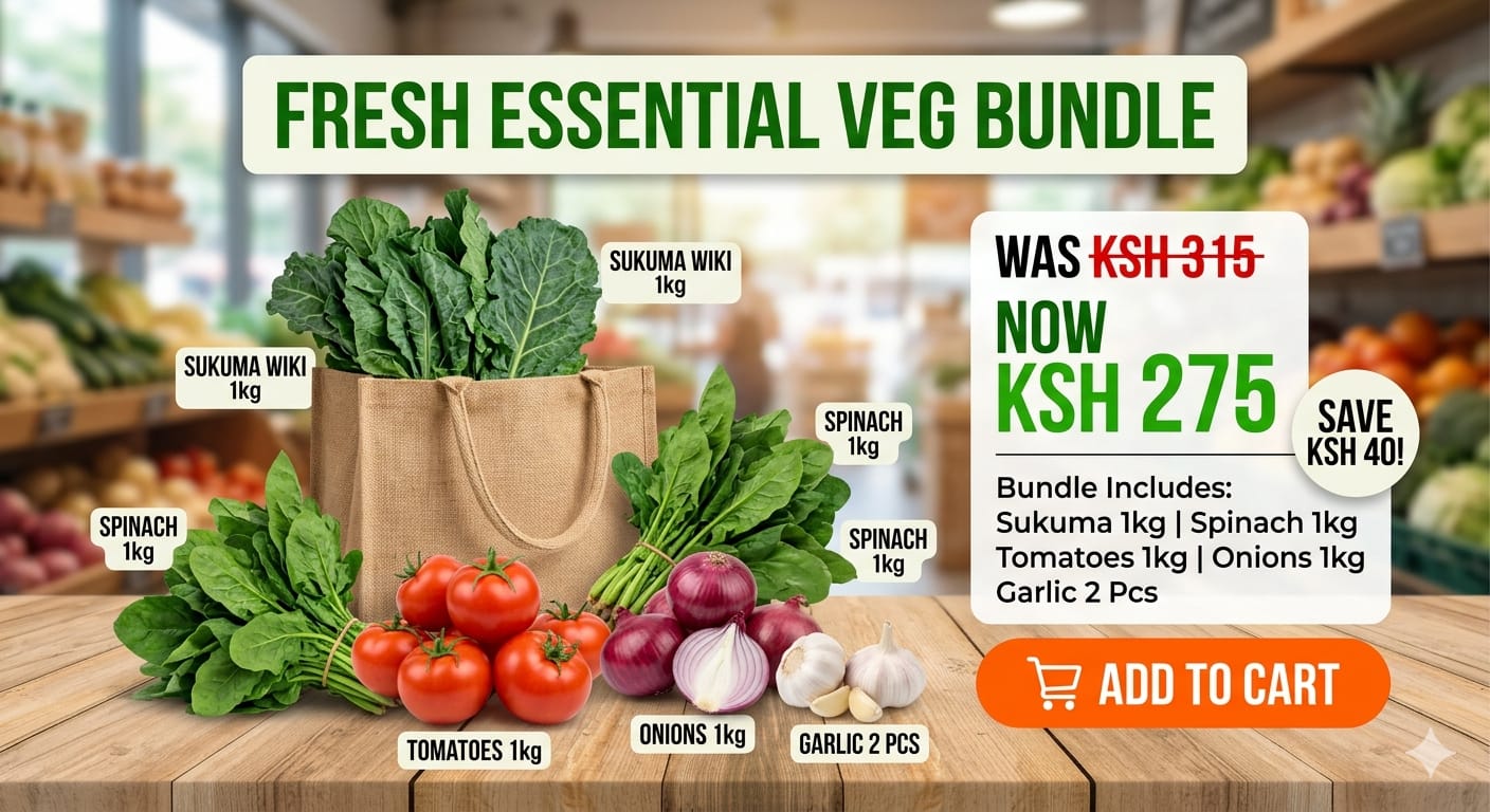 sukuma 1kg,spinach 1kg, tomatoes 1kg, garlic 2pc. onions 1kg